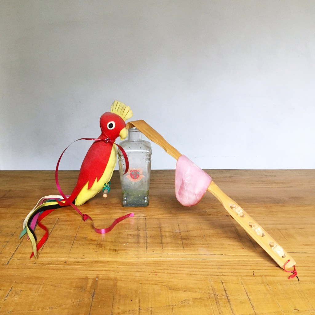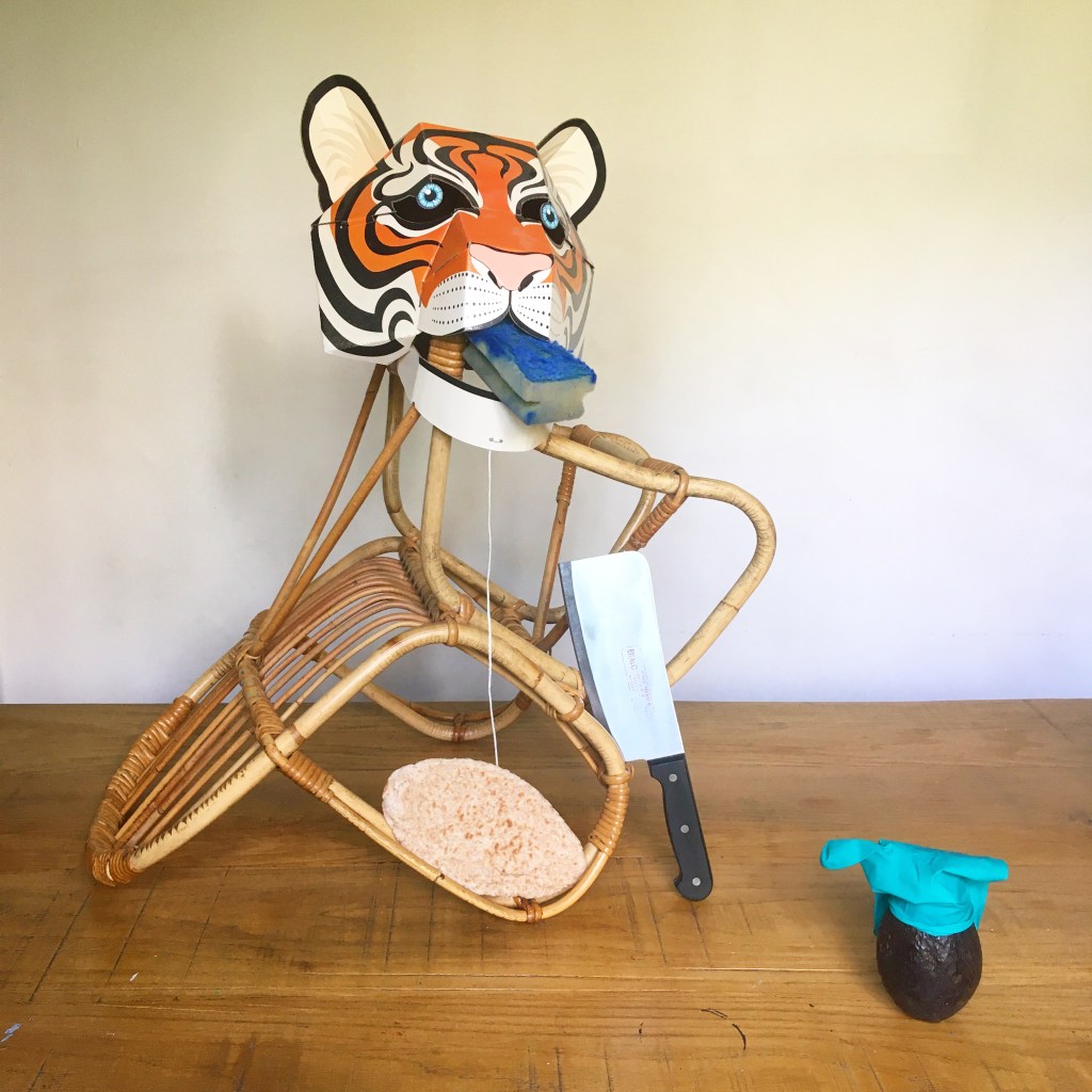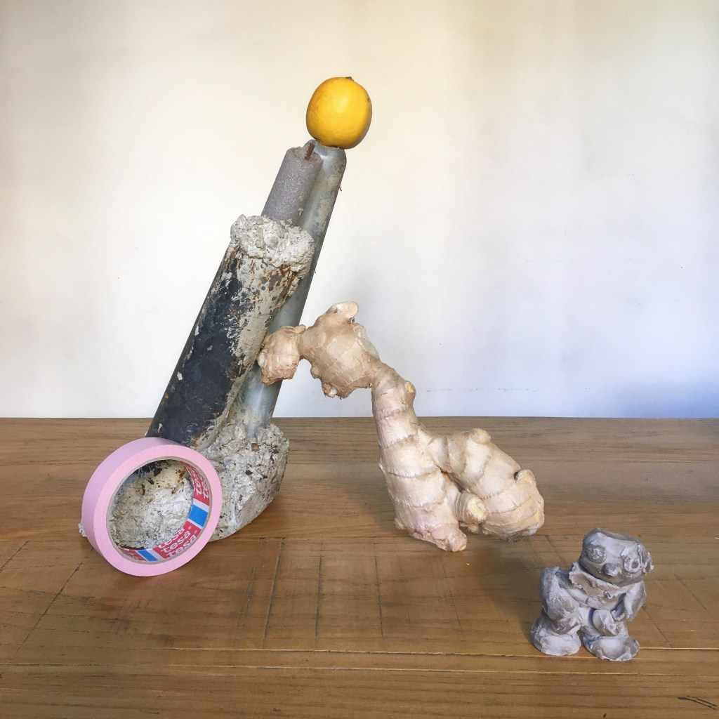 Still life with furry panda mask, Phoenix table lamp, plums, tongs and frozen bangers, 2020Still life with pink tape, one of my sculptures, little clay man whose head comes off, ginger and lemon, 2020Still life with granny’s parrot, bottle found in garden, back scratcher and smoked ham, 2020Still life with Littleun’s wicker chair, tiger mask, blue scourer, cleaver, surgical gloves, avocado and pitta, 2020Still life with bowl from hell, mini wheelie bin and astro turf, 2020Still life with creepy squeaky 70s toy, basketball, vase, flacid space hopper, spade and smoked ham, 2020Still life with yellow postal sack, mini skateboard, wip sculpture with mop head, and scrambled egg, 2020Still life with yellow tape, Lego head, smoked haddock, Eeyore balloon, watering can and Panama hat, 2020Still life with little puppet of Caliban, ‘untitled’, hose with tape and string, bacon and 70s pan, 2020Still life with my boring postcards collage book, breaded ham, glove and candlestick, 2020Still life with snake in a bottle, biggest roll of gaffer tape ever, granny’s opera glasses and egg, 2020Still life with tower of tagliatelle, fruit sticker, squished shopping basket, enamel jug that leaks and my fave sneaks, 2020Still life with first attempt at welding, anchovy, potato and monkey, 2020Still life with minion, cornet, parma ham, adidas, blue masking tape and feather duster, 2020